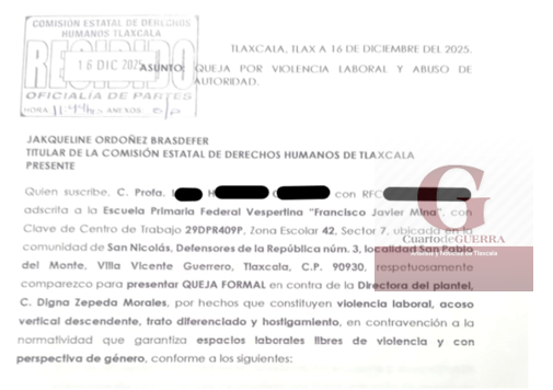 Crece la indignación en la comunidad educativa de la Escuela Primaria “Francisco Javier Mina”, luego de que se denunciara públicamente la actuación de la supervisora escolar Agustina Dejesús Cruz Gutiérrez, adscrita a la Zona Escolar 42, por presuntamente revictimizar, humillar y amedrentar a una docente que presentó una queja ante la Comisión Estatal de Derechos Humanos de Tlaxcala (CEDHT) contra la directora del plantel, Digna Zepeda Morales.