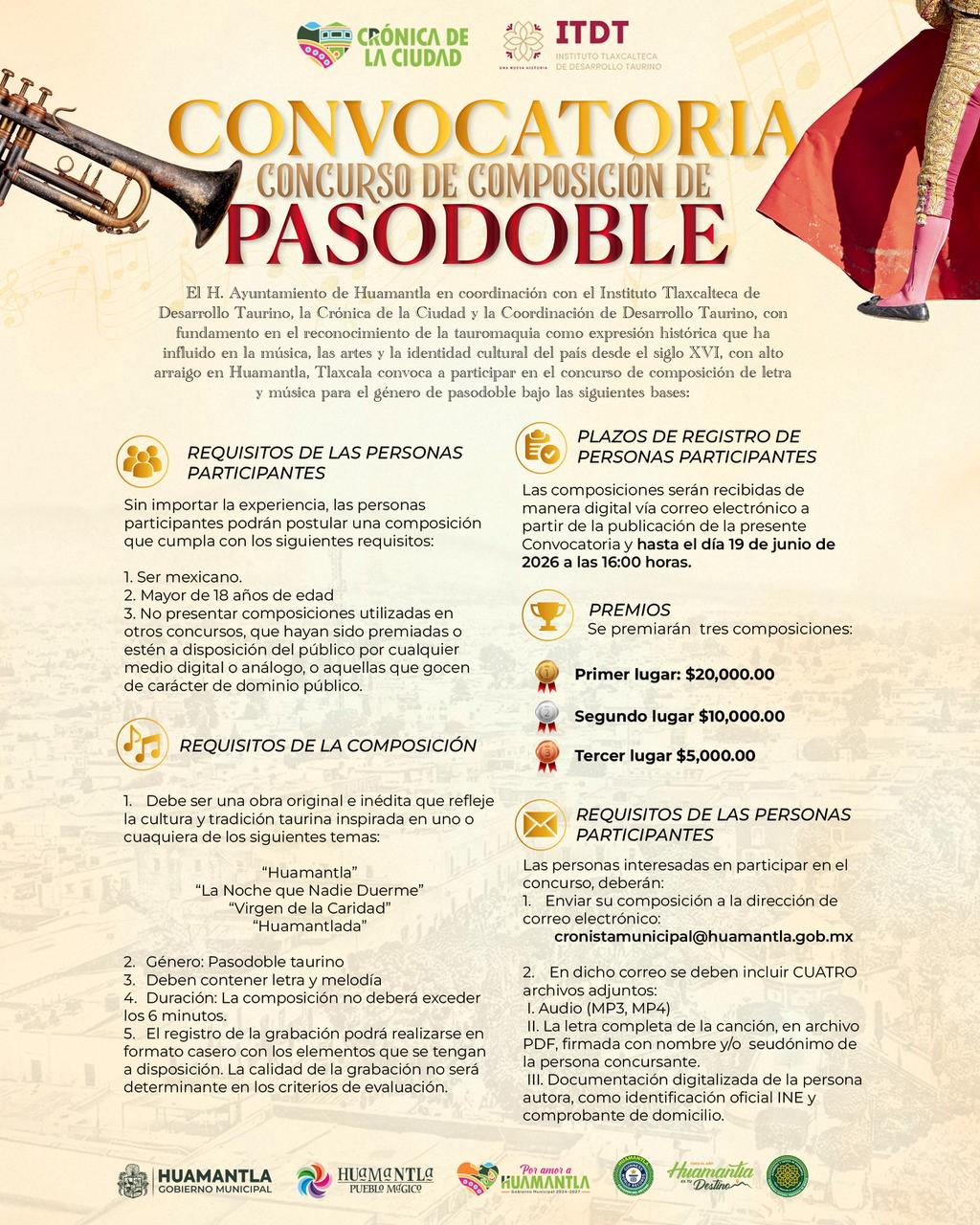 Con el objetivo de fortalecer y difundir una de las expresiones musicales más representativas de la tradición taurina, el Gobierno Municipal de Huamantla, en coordinación con el Instituto Tlaxcalteca de Desarrollo Taurino, la Crónica de la Ciudad y la Coordinación de Desarrollo Taurino, invita a la ciudadanía a participar en el Concurso de Composición de Pasodoble.