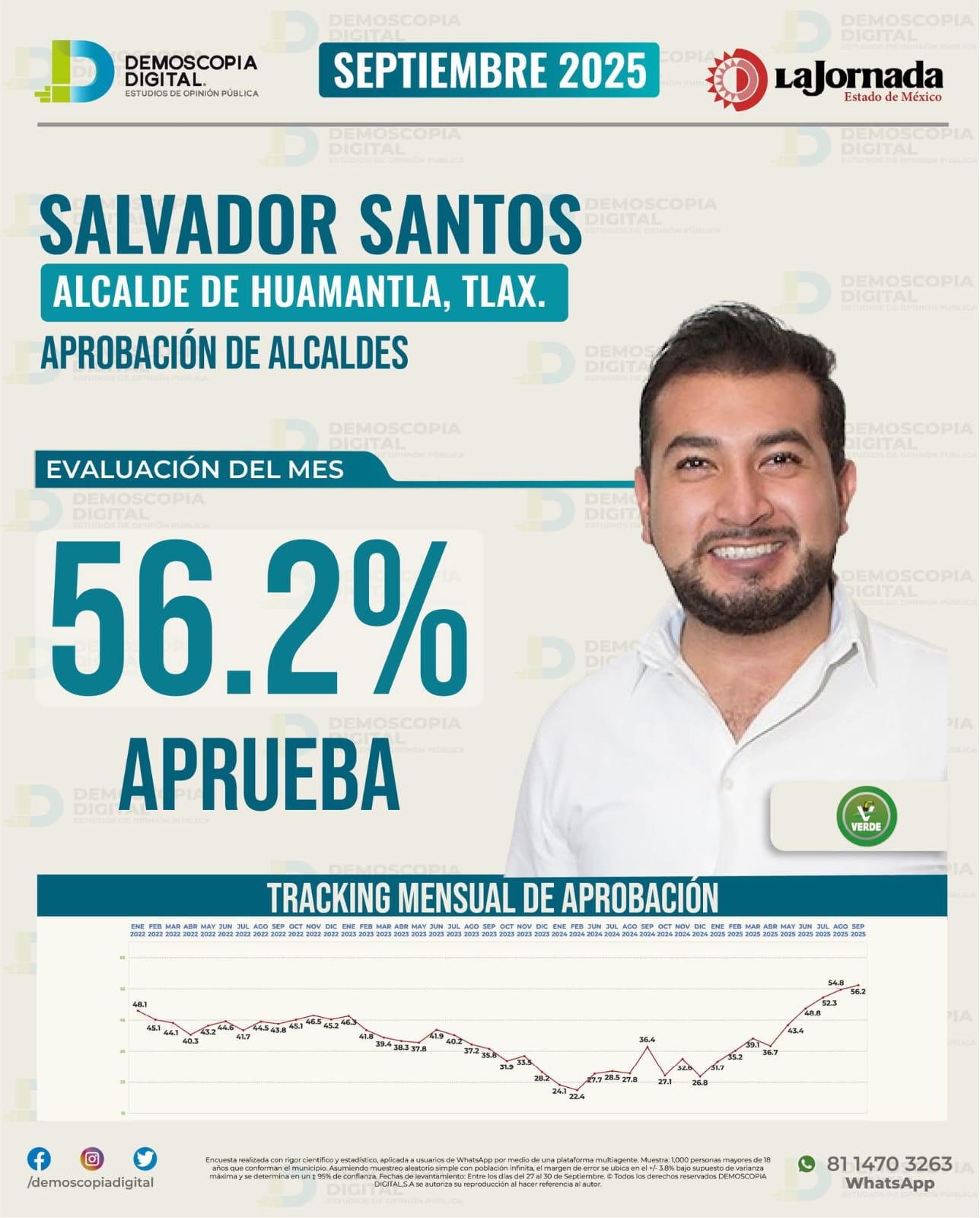 En el más reciente estudio de opinión correspondiente al mes de septiembre, la casa encuestadora Demoscopia Digital reveló que el Presidente Municipal de Huamantla, Salvador Santos Cedillo, alcanzó un 56.2 % de aceptación ciudadana, ubicándose en el segundo lugar dentro del ranking de alcaldes del estado de Tlaxcala.