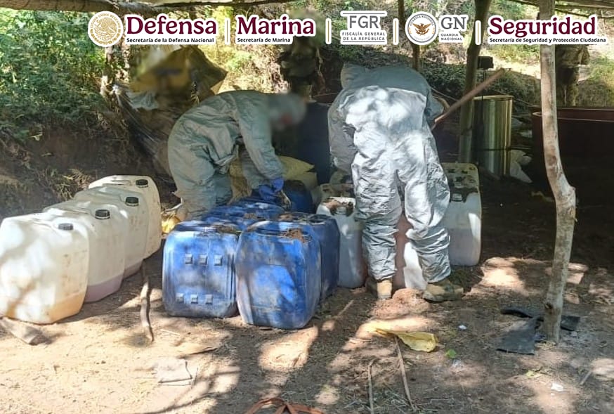 En el municipio de Badiraguato se localizó un área de concentración para la fabricación de drogas sintéticas, donde se aseguraron 6 mil litros de precursores químicos, seis cargadores, 639 cartuchos, una granada de mano, 10 kilos de marihuana, 10 kilos de semilla de amapola, cinco kilos de semilla de marihuana, seis motocicletas y un vehículo.