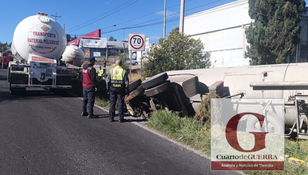 Vuelca pipa en Yauhquemehcan y provoca cortes en la Apizaco-Tlaxcala por trasvase de gasolina