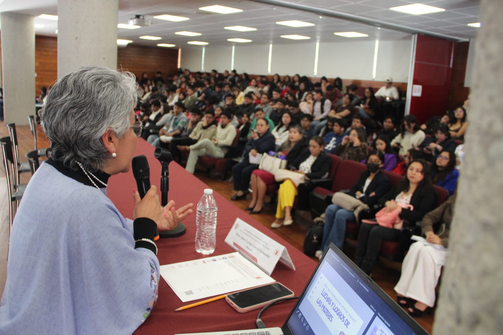 Ante estudiantes de Derecho, Ciencias Políticas y Administración Pública y Criminología, reunidos en el Auditorio Interactivo “Manuel de Lardizábal y Uribe”, la Maestra Cuevas Fernández señaló que esta fecha invita a reflexionar sobre los avances alcanzados en favor de los derechos de las mujeres; sin embargo, aún persisten retos por atender, por ello la importancia de seguir impulsando acciones que permitan enfrentar diversas problemáticas sociales y avanzar hacia condiciones de mayor igualdad y oportunidades para todas y todos.