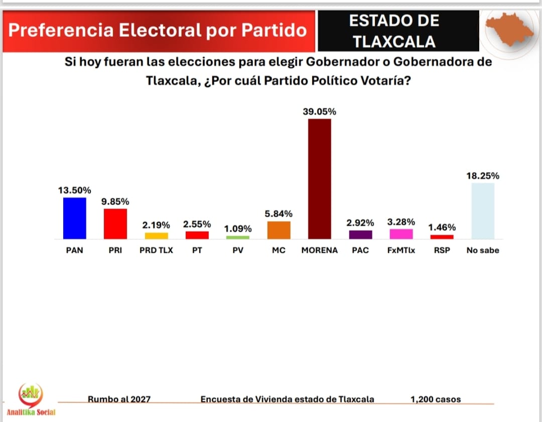 A poco más de un año y medio de la contienda por la gubernatura de Tlaxcala en 2027, el partido Morena se posiciona como la principal fuerza política en la entidad, y tras el respaldo mostrado en en diferentes plataformas digitales hacia Alfonso Sánchez, el estudio levantado por la empresa Analitika entre el 24 y 28 de noviembre de 2025 muestra una clara tendencia a favor de la izquierda, aunque la competencia interna se mantiene reñida.