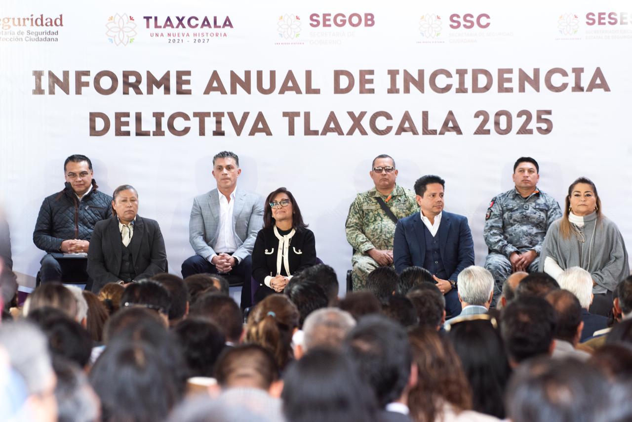 • Autoridades presentan el Informe Anual de Incidencia Delictiva Tlaxcala 2025; Lorena Cuéllar anuncia reforzamiento de patrullajes, iluminación, operativos y tecnológica, para que la seguridad que muestran los datos se sienta en la calle.