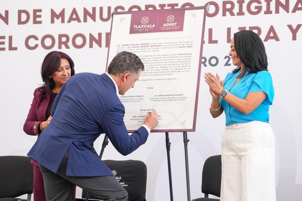 El presidente municipal de Tlaxcala, Alfonso Sánchez García, acudió este viernes a la Ceremonia de Donación del manuscrito original del siglo XIX del coronel Miguel N. Lira y Ortega que recibió el Gobierno del Estado, en la que firmó como testigo de honor.