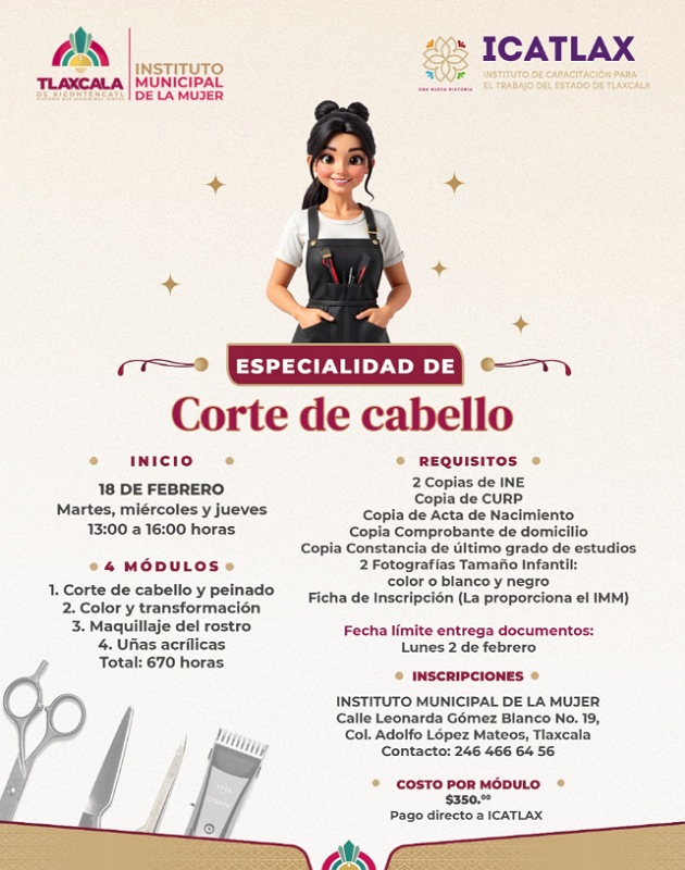 El curso con Especialidad en Corte de Cabello, dará inicio el próximo 18 de febrero, y se impartirá en coordinación con el ICATLAX mediante una cuota de 350 pesos, los días martes, miércoles y jueves, de 13:00 a 16:00 horas, con una duración total de 670 horas distribuidas en cuatro módulos: corte de cabello y peinado, color y transformación, maquillaje del rostro y uñas acrílicas.