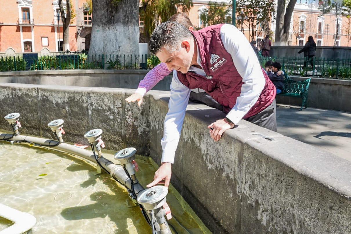 A fin de supervisar las condiciones de las fuentes del Centro Histórico de Tlaxcala, el presidente municipal Alfonso Sánchez García realizó un recorrido por la plaza central y la zona de San José.