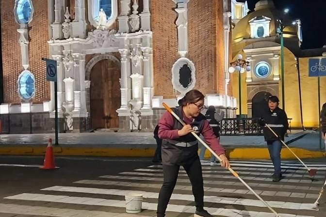 Cuadrillas municipales de Tlaxcala realizan labores nocturnas para mejorar la imagen urbana en la capital