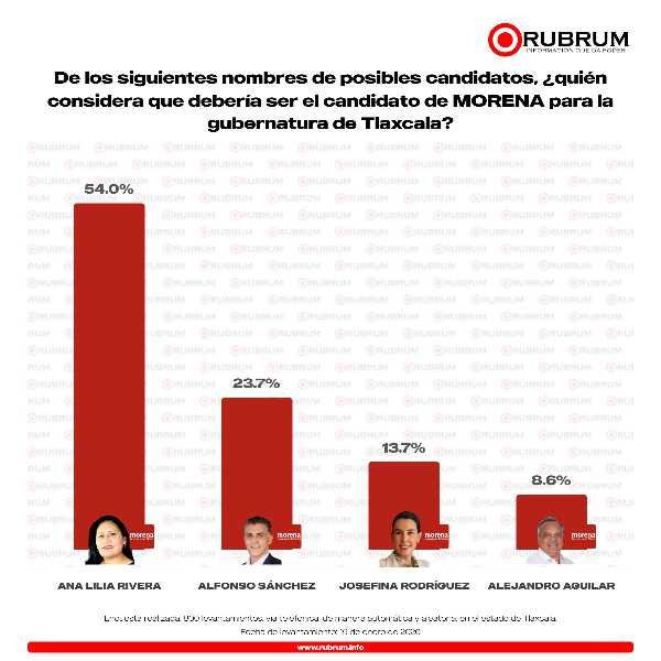 Los más recientes estudios de opinión pública, publicados en enero de 2026 por las casas encuestadoras Cripes y Rubrum, colocan a la Senadora Ana Lilia Rivera Rivera como la principal aspirante de Morena a la candidatura al gobierno de Tlaxcala, al encabezar con amplia ventaja las preferencias entre los perfiles evaluados.