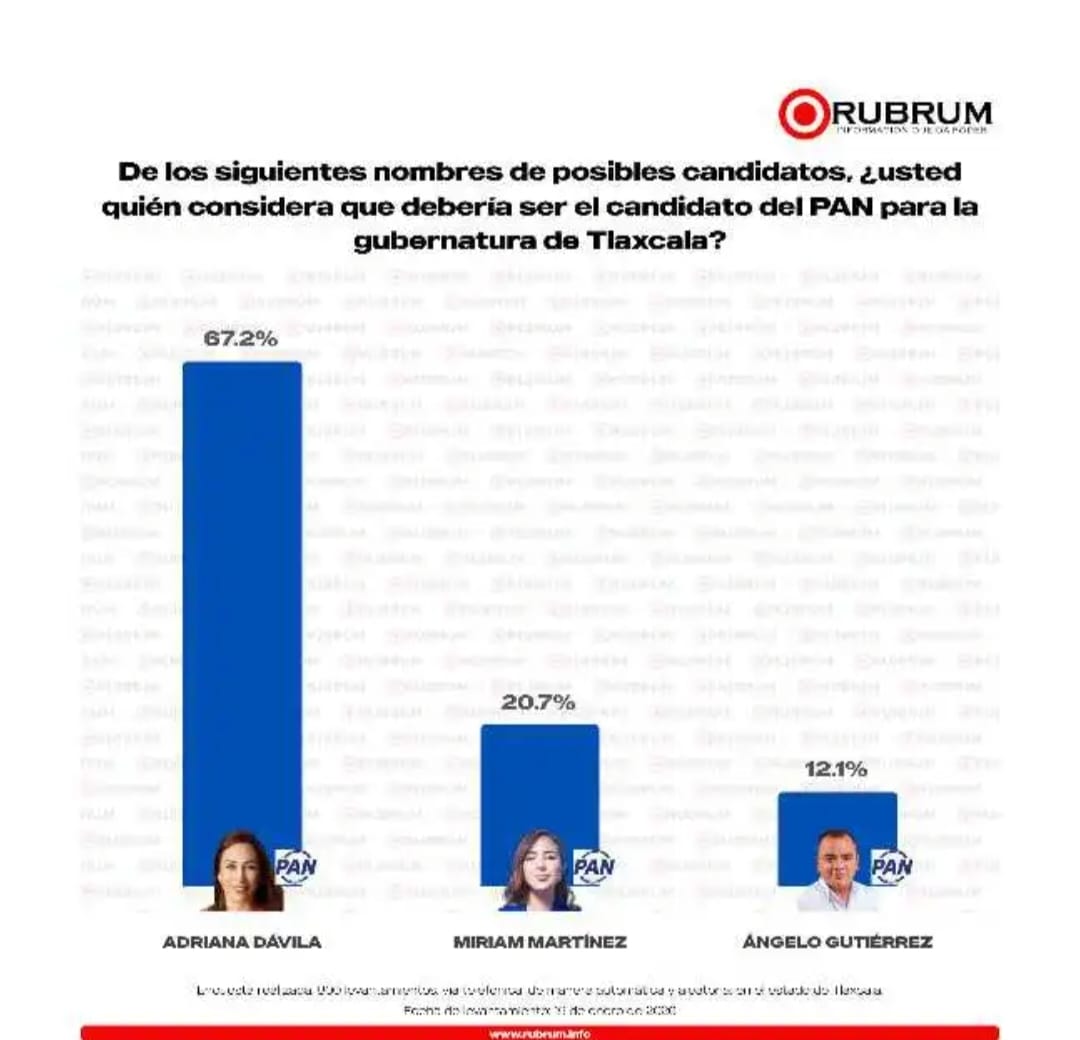 En el caso del PAN, el 67.2% opinó que Adriana Dávila; 20.7% Miriam Martínez; y 12.1 Ángelo Gutiérrez.