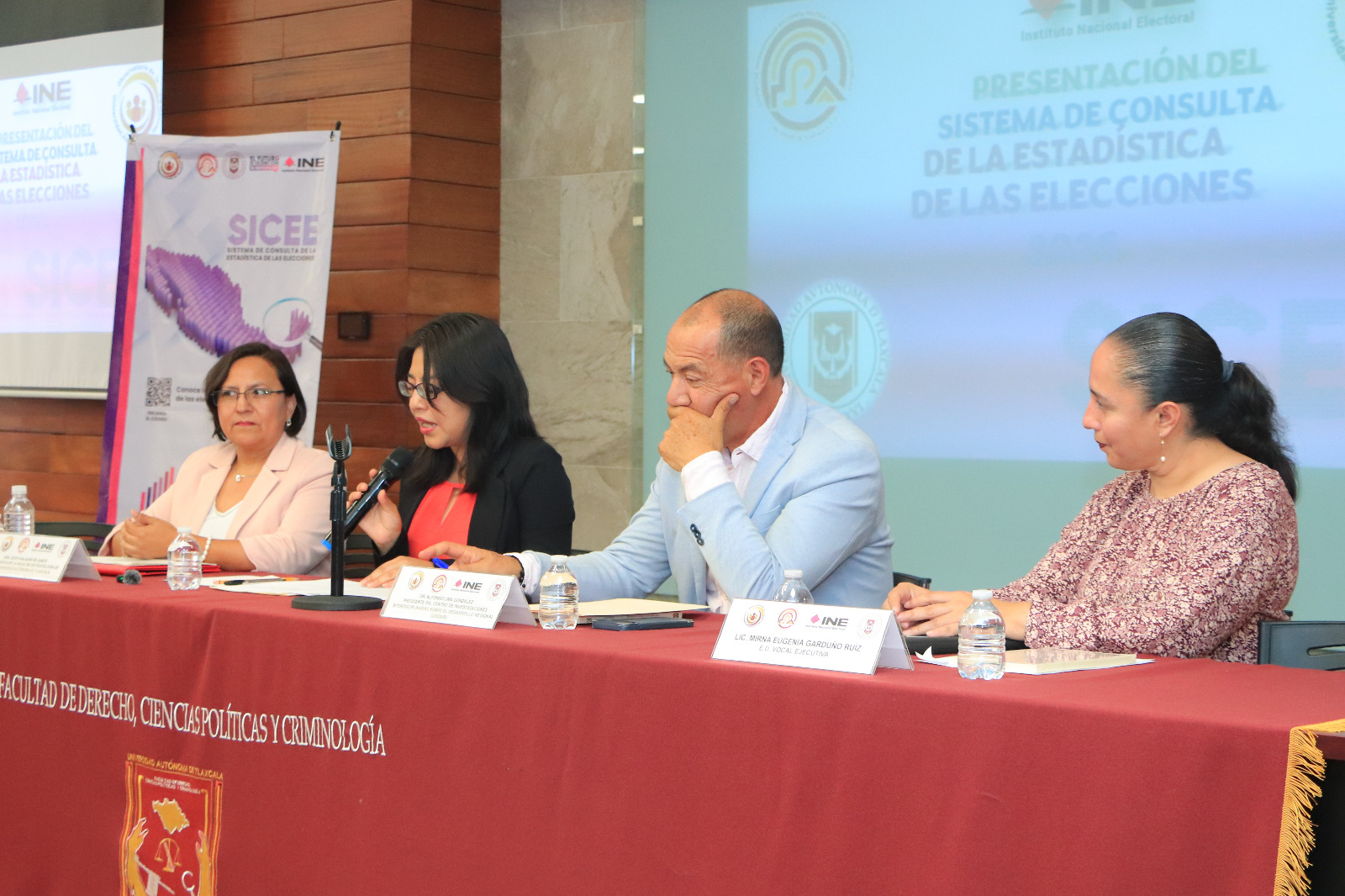En la mesa de trabajo de presentación del Sistema de Consulta de la Estadística de las Elecciones y de los Conteos Censales de Participación Ciudadana 2009-2024, se contó con la intervención de la Licenciada Mirna Eugenia Garduño Ruiz, encargada el despacho en el cargo de Vocal Ejecutivo y de la Junta Local Ejecutiva del INE en Tlaxcala; Doctor Alfonso Lima Gutiérrez, Coordinador General del Centro de Investigaciones Sobre Desarrollo Regional UATx: Doctora Edith Salazar Degante, catedrática de la Facultad de Trabajo Social, Sociología y Psicología; y fue moderado por la Maestra Alejandrina Santillán Martínez, doctorante del Centro de Investigación Educativa UATx.