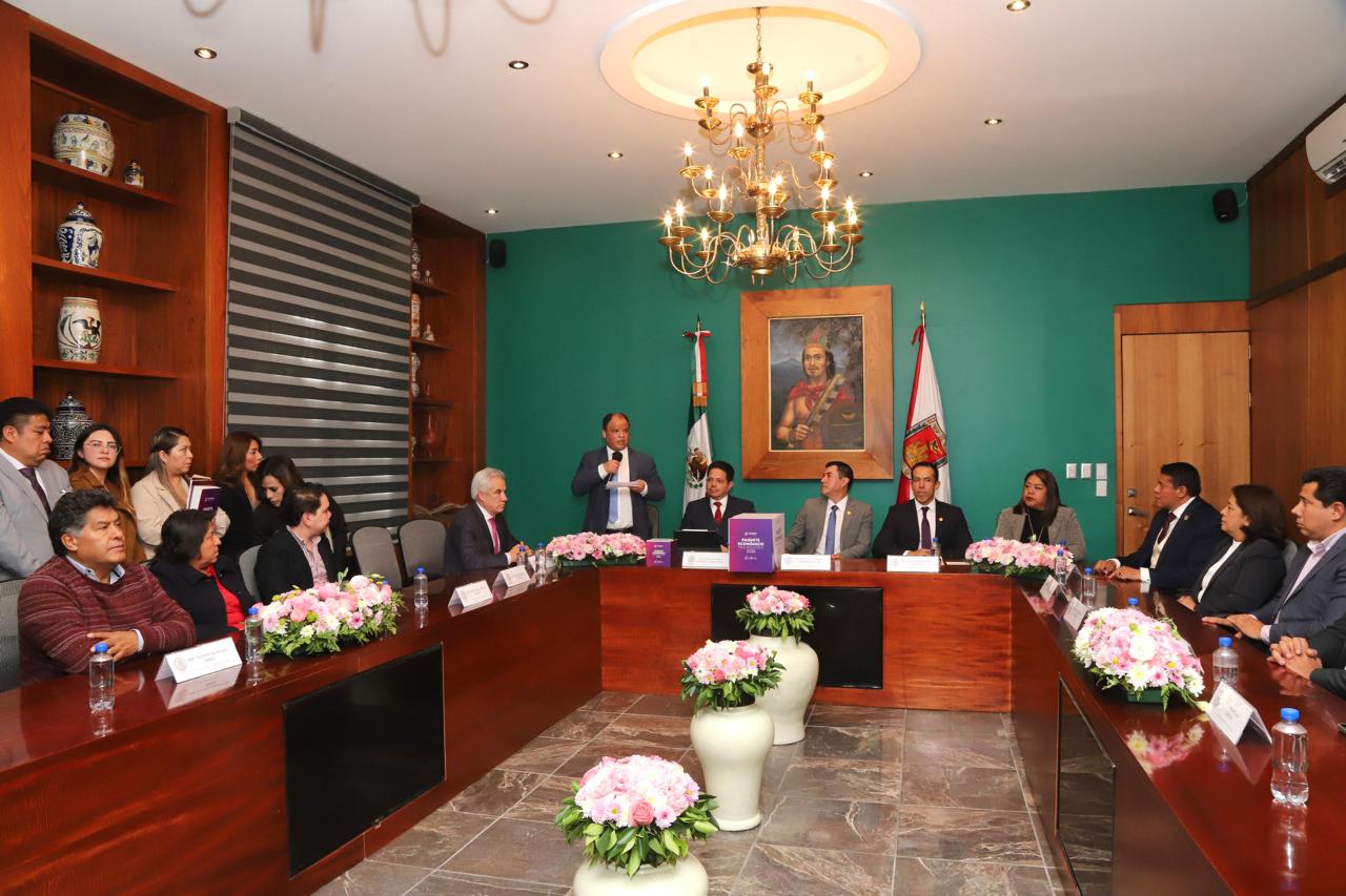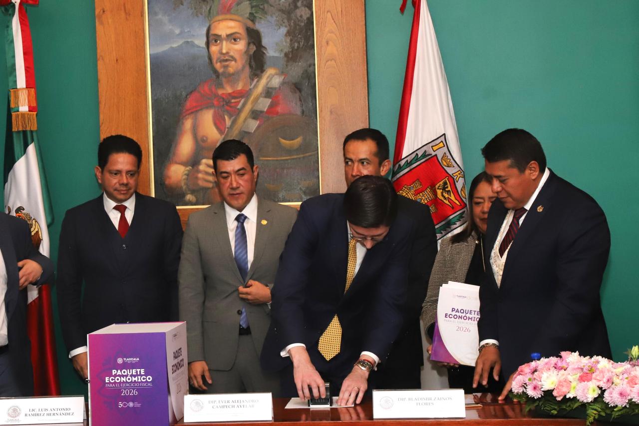 En el salón verde del recinto legislativo, los funcionarios, acompañados de integrantes del gabinete legal, entregaron de manera formal a la presidenta de la Mesa Directiva, Maribel León Cruz; el presidente de la Junta de Coordinación y Concertación Política, Éver Alejandro Campech Aguilar, y al presidente de la Comisión de Finanzas y Fiscalización, Bladimir Zainos Flores, el documento que contiene la Ley de Ingresos y el Presupuesto de Egresos para el próximo ejercicio fiscal, así como diversas reformas al Código Financiero para el Estado de Tlaxcala y sus Municipios.