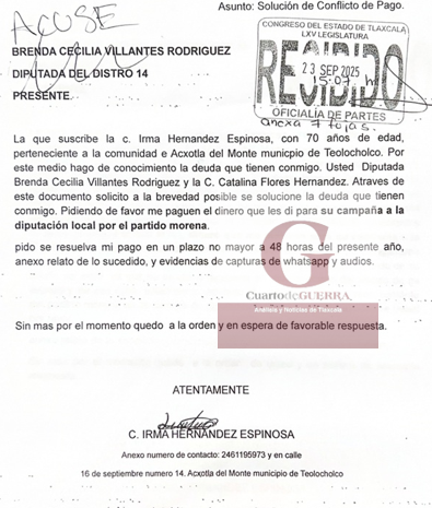 (Ana Rojano) Una mujer de 70 años, de nombre Irma Hernández Espinosa, originaria de la comunidad de Acxotla del Monte, municipio de Teolocholco, presentó diversos escritos dirigidos a autoridades y representantes del partido Morena en Tlaxcala, para denunciar una presunta deuda de 280 mil pesos que, afirma, mantienen con ella la diputada local Brenda Cecilia Villantes Rodríguez y su tía Catalina Flores Hernández.