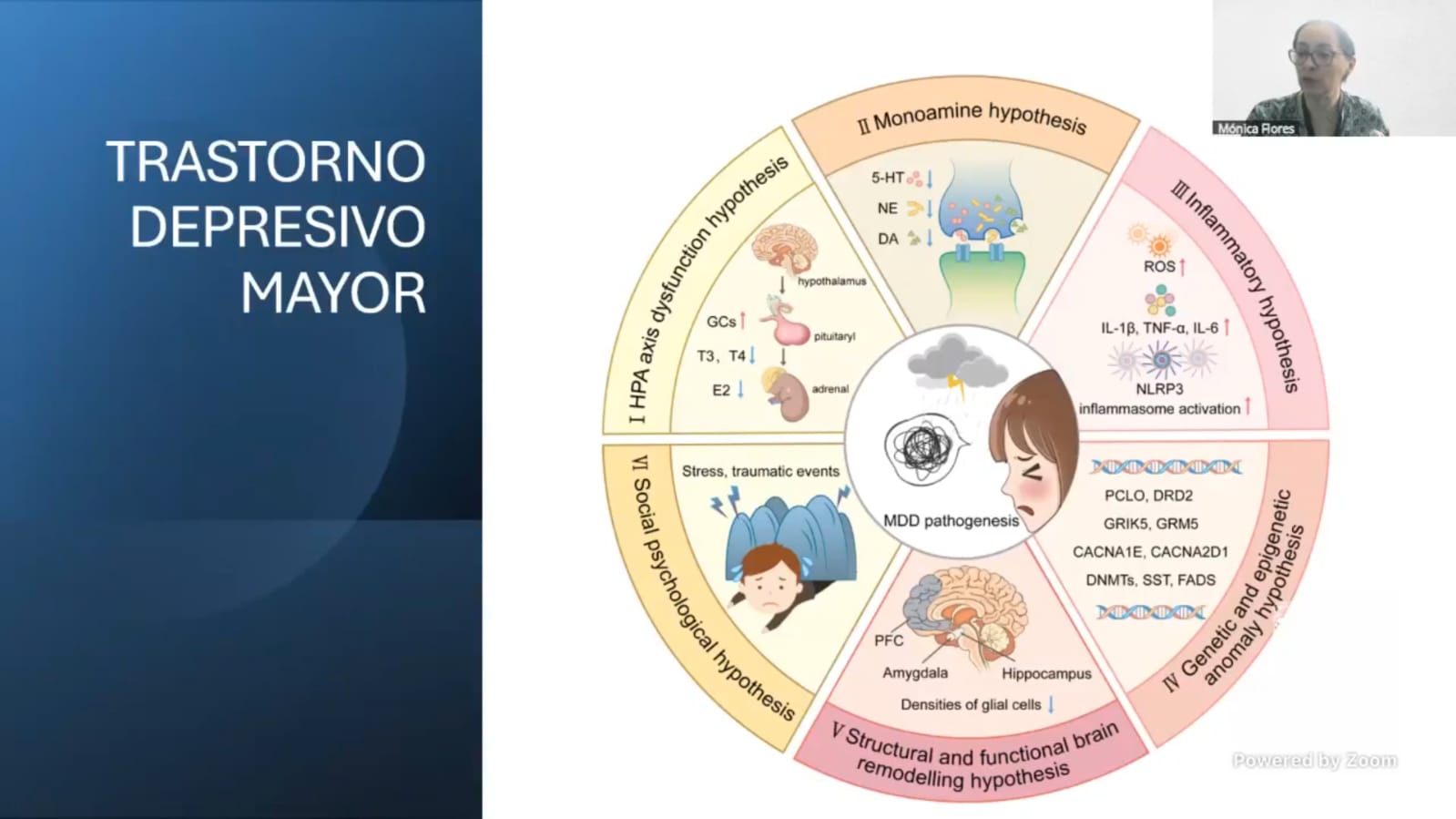 La Doctora Flores Ramos especificó que la depresión es un trastorno mental frecuente, se calcula que afecta a 350 millones de personas en el mundo, afectando más a mujeres que hombres. En su proyecto de investigación sobre el ambiente enriquecido y depresión, plantea que un entorno enriquecido que estimula la actividad física, cognitiva y social puede mejorar la respuesta al tratamiento farmacológico en personas con depresión; dicho estudio analiza cómo factores ambientales pueden modular la neuroplasticidad y favorecer la recuperación emocional.