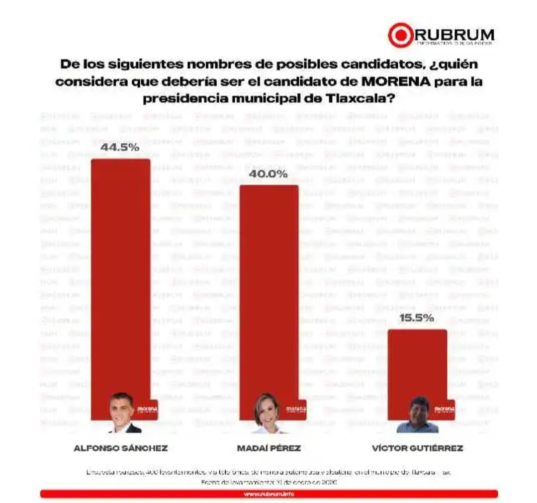 (Ana Rojano) De cara al proceso electoral de 2027, la más reciente encuesta publicada por Rubrum revela que MORENA es la fuerza política con mayor intención de voto rumbo a la renovación de la presidencia municipal de Tlaxcala, con 31.2 % de las preferencias entre los encuestados. Le siguen el PRI con 16.4 %, Movimiento Ciudadano (MC) con 12.4 % y el PAN con 11.5 %. Un porcentaje considerable de la ciudadanía —28.5 %— se mantiene aún indecisa sobre su voto.