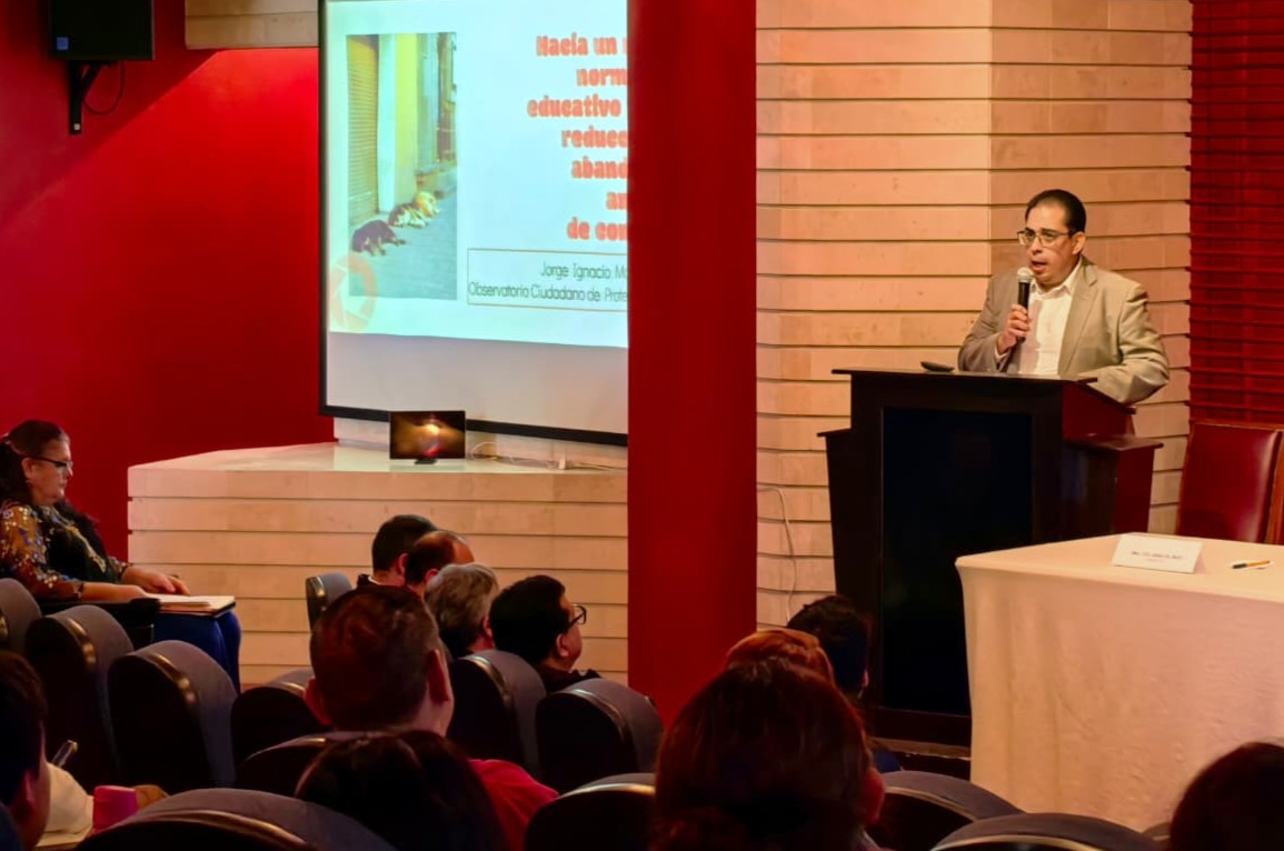 El Foro inició con la ponencia 𝐄𝐬𝐭𝐫𝐚𝐭𝐞𝐠𝐢𝐚 𝐝𝐞 𝐞𝐬𝐭𝐚𝐛𝐢𝐥𝐢𝐳𝐚𝐜𝐢𝐨́𝐧 𝐞𝐧 𝐥𝐚 𝐩𝐨𝐛𝐥𝐚𝐜𝐢𝐨́𝐧 𝐜𝐚𝐧𝐢𝐧𝐚 𝐲 𝐟𝐞𝐥𝐢𝐧𝐚 𝐞𝐧 𝐞𝐥 𝐞𝐬𝐭𝐚𝐝𝐨 𝐝𝐞 𝐓𝐥𝐚𝐱𝐜𝐚𝐥𝐚 a cargo de la Doctora Silvia Yolanda Altamirano Zainos, Directora del Centro Veterinario Antirrábico, quien especificó que no todas las personas cuentan con las condiciones necesarias para ser tutores responsables y enfatizó la necesidad de políticas públicas para reducir la población de animales en situación de calle.