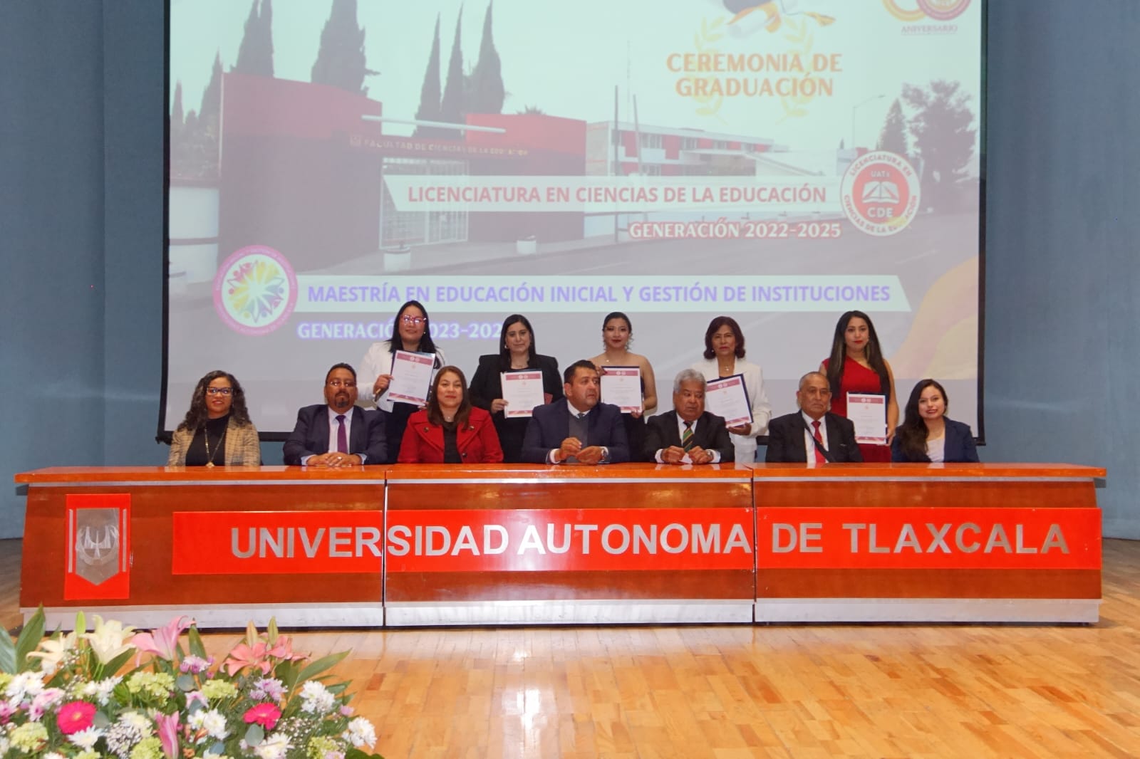 En solemne ceremonia celebrada en el Teatro Universitario, 59 egresados de la Licenciatura en Ciencias de la Educación, generación 2022-2025, y 13 de la Maestría en Educación Inicial y Gestión de Instituciones, generación 2023-2025, de la Facultad de Ciencias de la Educación de la Universidad Autónoma de Tlaxcala (FCE-UATx) recibieron la constancia que avala la conclusión de su formación.