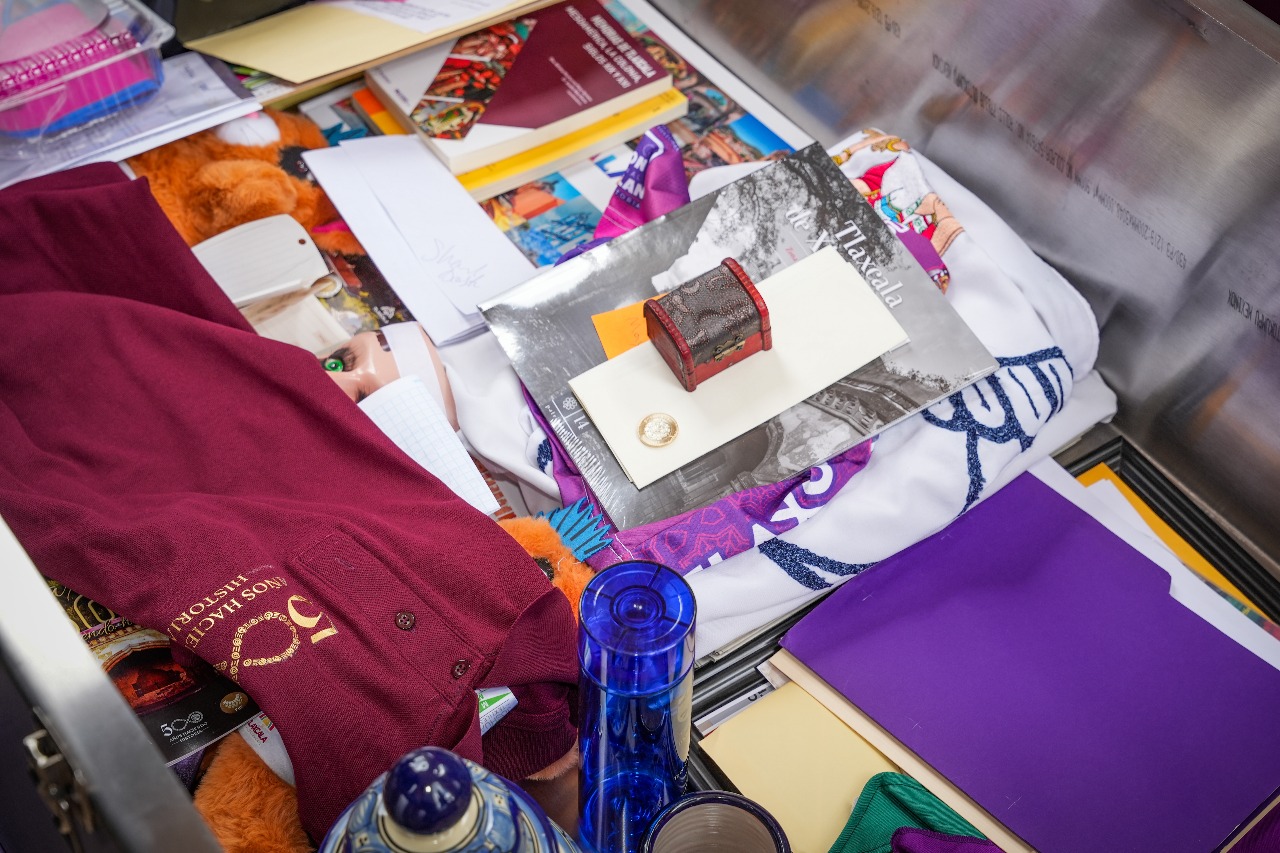 En el interior de la cápsula fueron resguardadas cartas, artesanías, trajes y máscaras de huehues, un bastón de mando y documentos que reflejan la vida cotidiana y los retos superados por la sociedad tlaxcalteca de 2025.