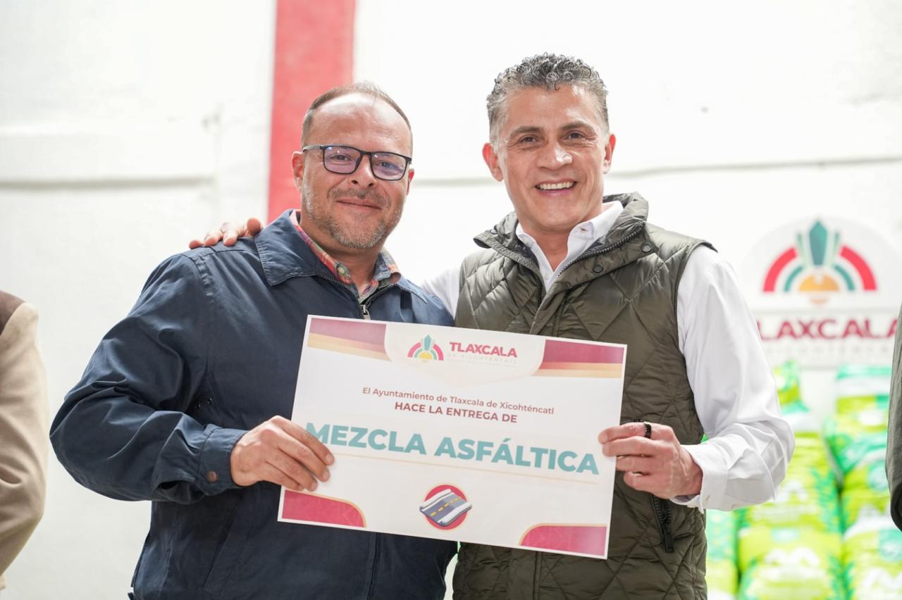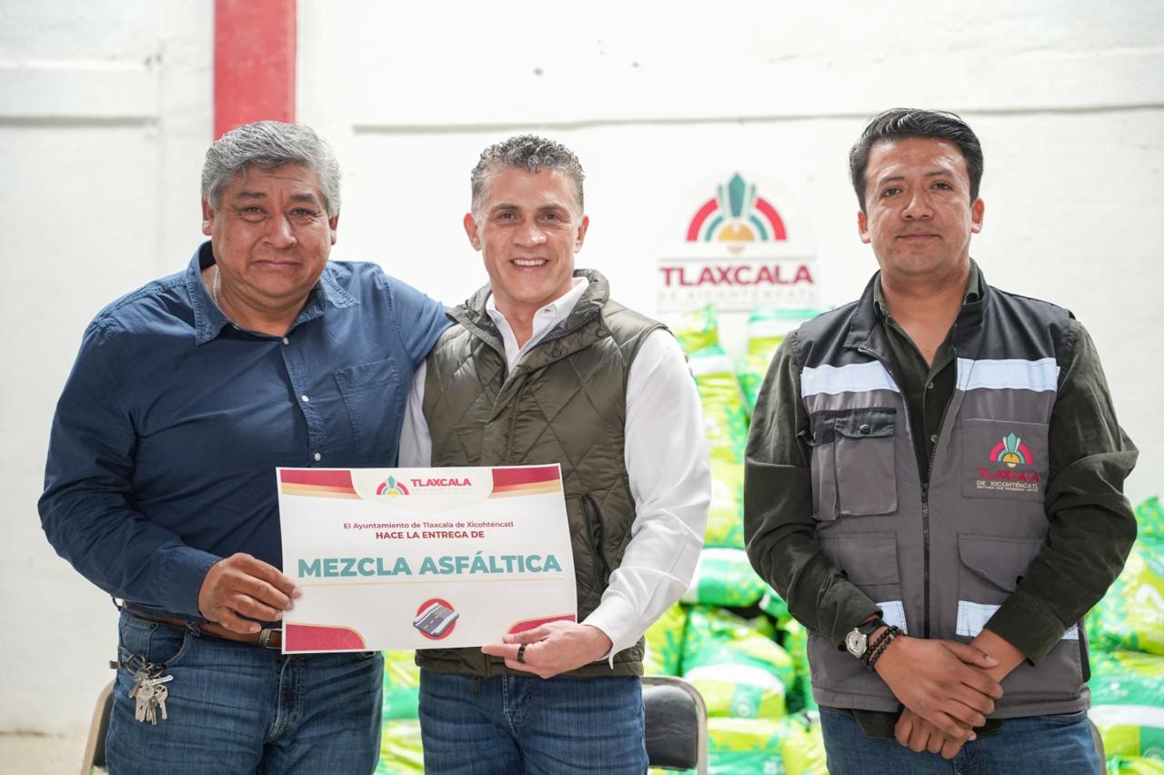 El presidente municipal de Tlaxcala, Alfonso Sánchez García, realizó la primera entrega de 50 toneladas de mezcla asfáltica en frío destinada a reforzar los trabajos de bacheo en 11 comunidades, delegaciones y la zona centro de la capital.