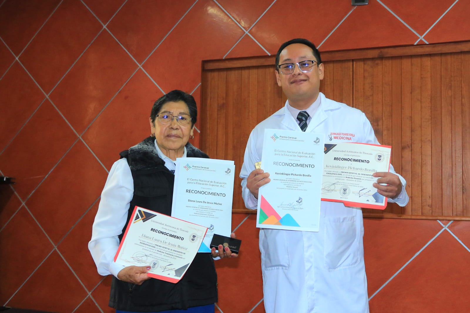 Kevin Klinger Pichardo Bonilla y Laura de Jesús Muñoz, estudiantes de las licenciaturas en Médico Cirujano y Medicina Veterinaria y Zootecnia de la Universidad Autónoma de Tlaxcala (UATx), recibieron el “Premio CENEVAL al Desempeño de Excelencia-EGEL” por haber obtenido un resultado sobresaliente en el examen de conocimientos aplicado en el periodo julio-diciembre 2024.