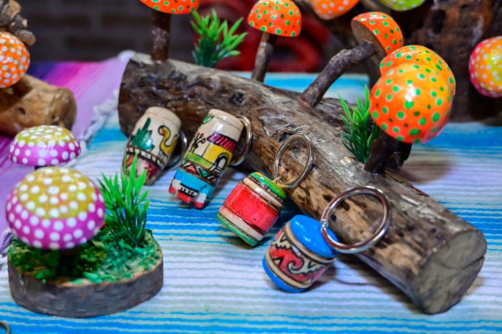 Destaca, por ejemplo, joyería con piedras naturales, piezas talladas en madera, creaciones de vidrio soplado, textiles bordados, pinturas sobre tela y madera, velas aromáticas, artículos de palma natural y herrería artística.