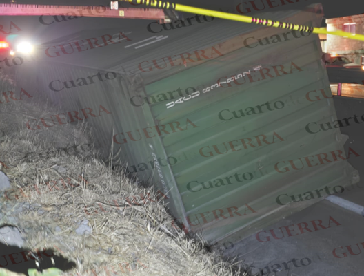 La pesada unidad terminó volcada sobre su costado derecho, provocando que el contenedor verde que remolcaba, de la marca "LOZANO", modelo 2007, se desprendiera y quedara proyectado metros más adelante. Por lo anterior, el operador quedó parcialmente aplastado por la cabina de la pesada unidad, perdiendo la vida de manera instantánea.