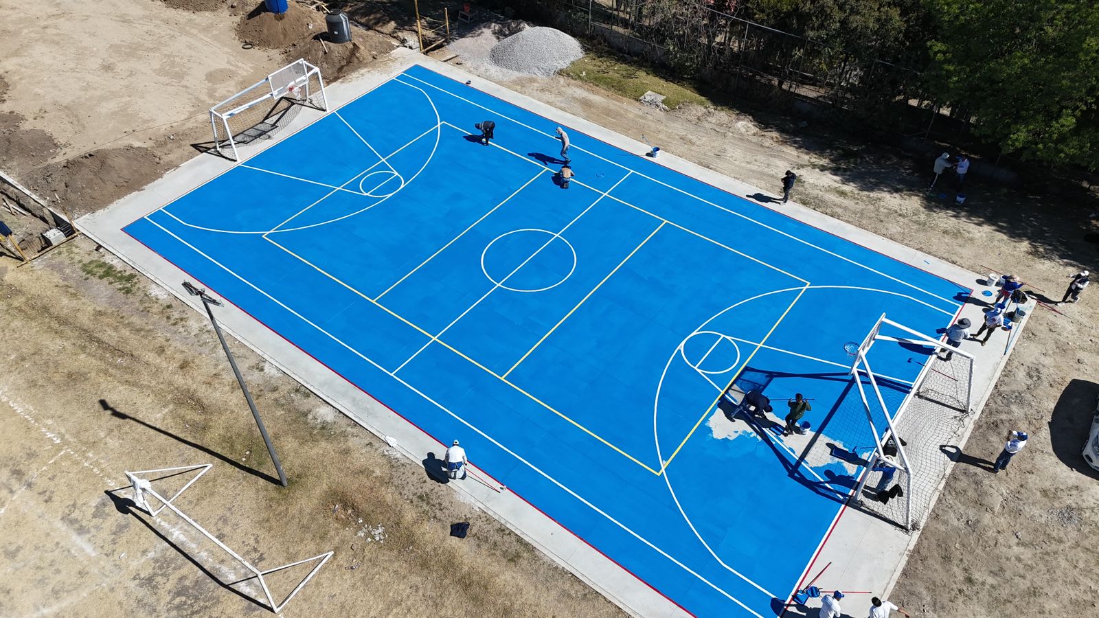 Además, se instalaron porterías de fútbol, tablero de básquetbol, redes y líneas reglamentarias para la práctica de básquetbol, fútbol y voleibol, aplicando pintura antiderrapante para brindar mejores condiciones de uso.