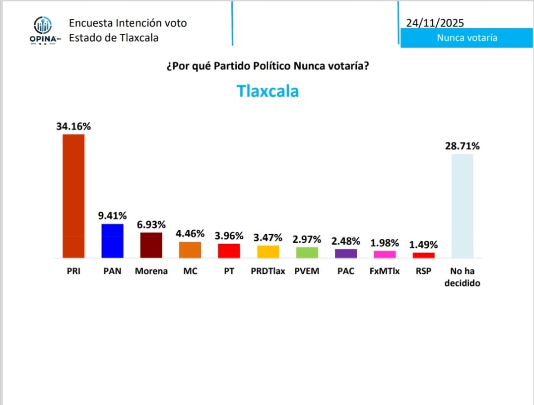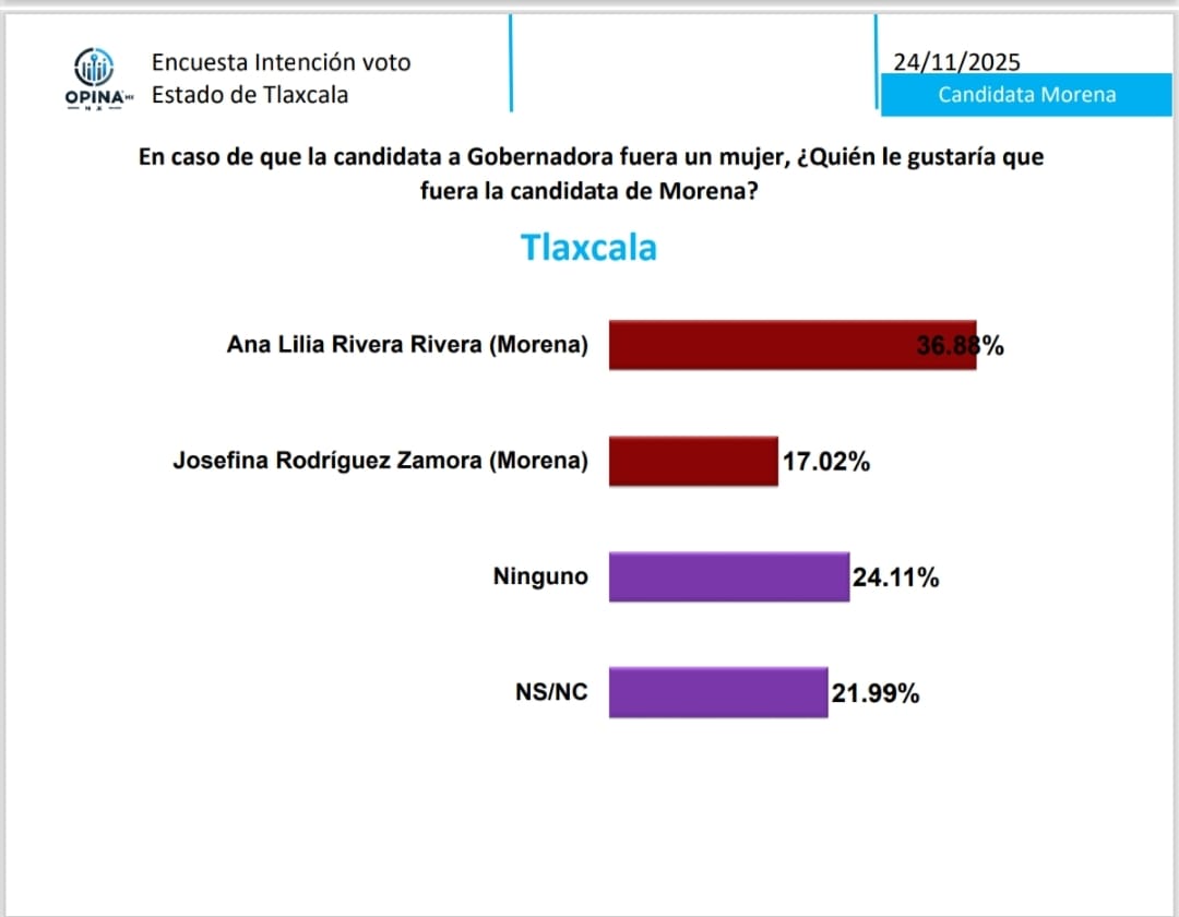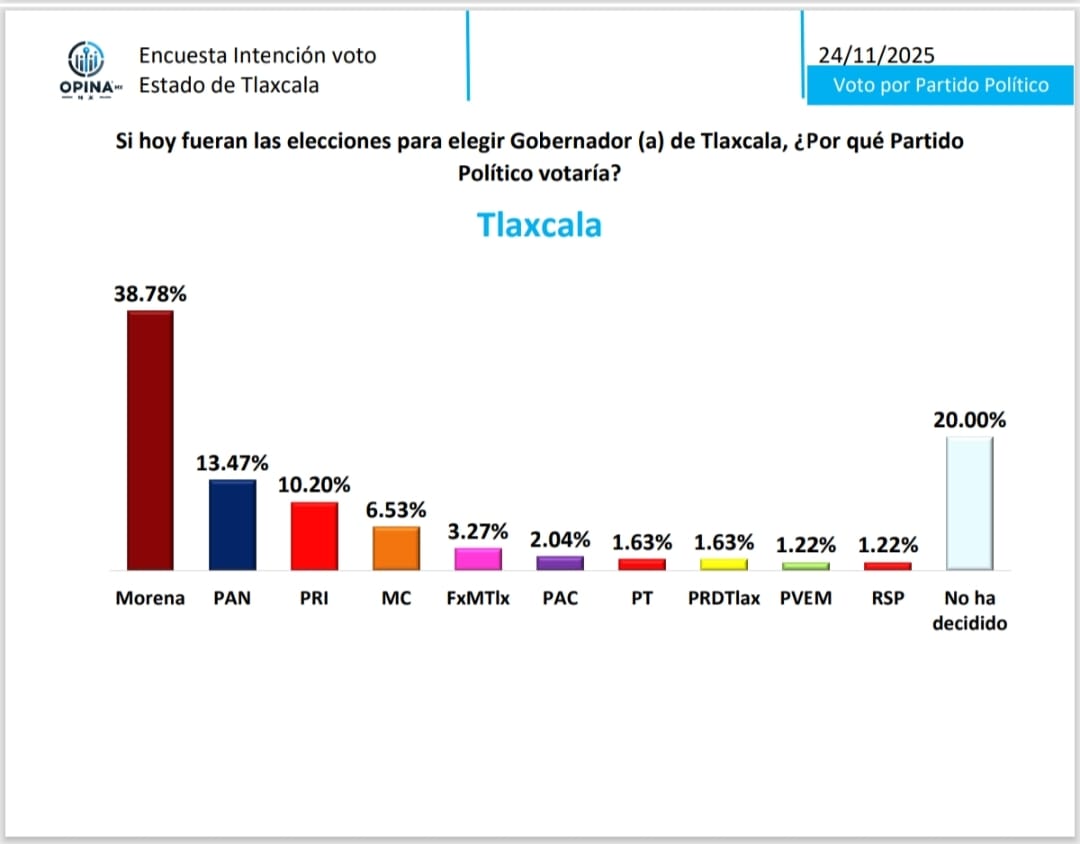 El partido Morena encabeza la intención de voto directo para la gubernatura de Tlaxcala, según los resultados de la encuesta de OPINA MX levantada en noviembre de 2025.