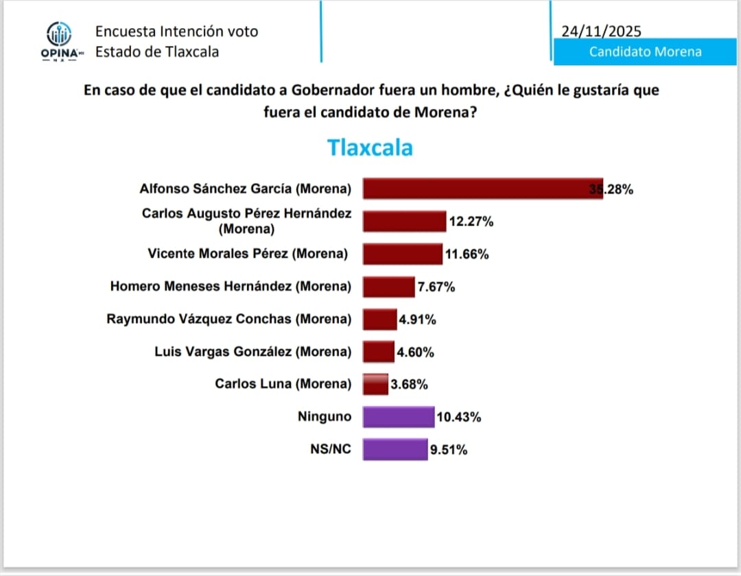 En cuanto al panorama de aspirantes al interior de Morena, el actual presidente municipal de Tlaxcala, Alfonso Sánchez García, se consolida como el perfil masculino mejor posicionado para la candidatura.