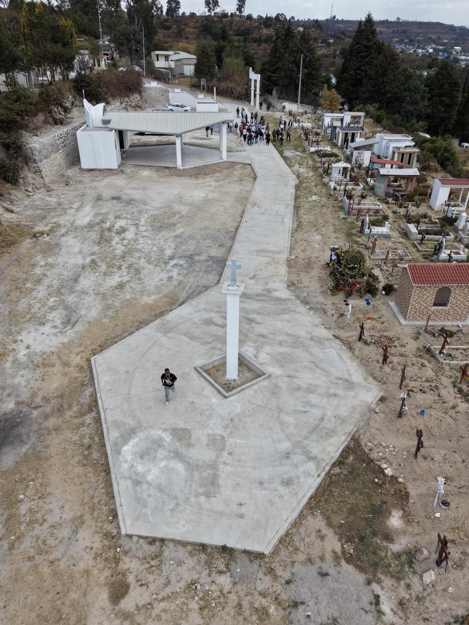 La obra contempló trabajos de nivelación del terreno, construcción de un muro de contención y el diseño de una capilla con techumbre, además de la edificación de la barda perimetral, escaleras, un pasillo central y dos estanques para almacenamiento de agua, infraestructura que anteriormente no existía en el lugar.