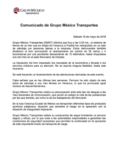 También en entrevista y expresando la preocupación por este tipo de actos vandálicos, la vocera explicó que es decisión de la empresa no suspender sus operaciones en las vías de los estados de Puebla y Veracruz, por lo que esperan poder sostener un diálogo con el Gobernador del puerto a efecto de garantizar condiciones de seguridad para operarios y la empresa.