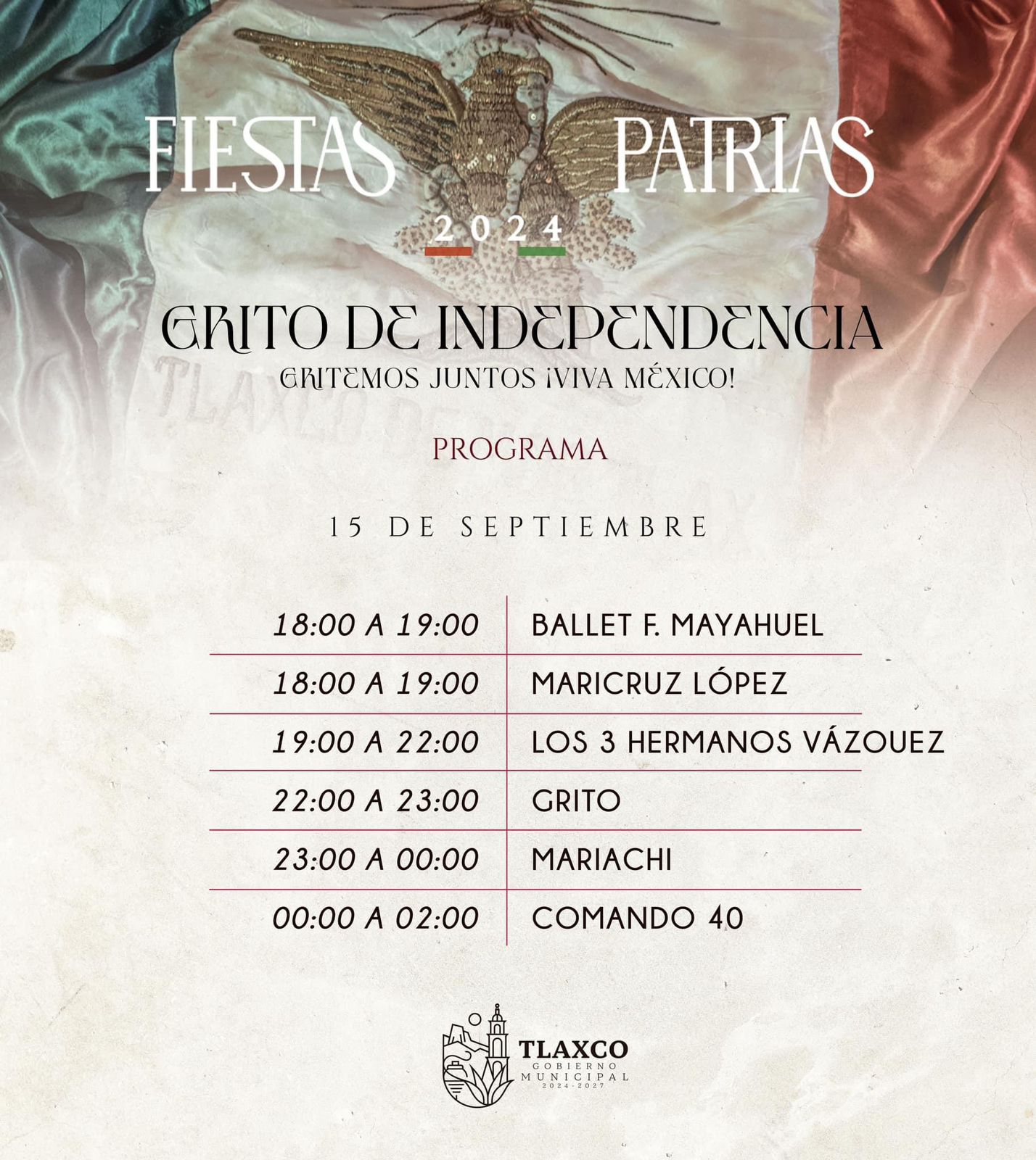 El gobierno municipal de Tlaxco invita a celebrar las fiestas patrias este 15 de septiembre, a partir de las 17:30 horas en el parque central.