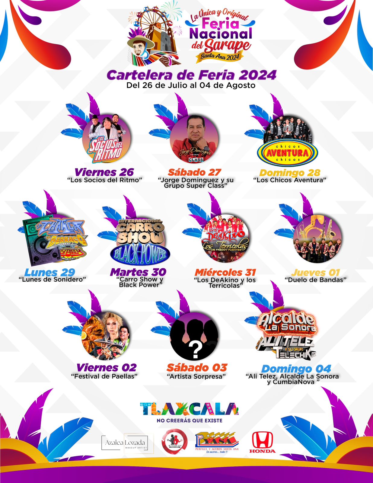 El sábado 27 de julio se presenta “Jorge Domínguez y su Grupo Super Class”; el domingo 28 contaremos con “Los Chicos Aventura” y para el lunes 29 se tendrá un “lunes de sonidero”; martes 30 nos deleitará “Carro Show y Black Power” y finalmente, el miércoles 31 se presentarán “Los DeAkino y los Terrícolas”.