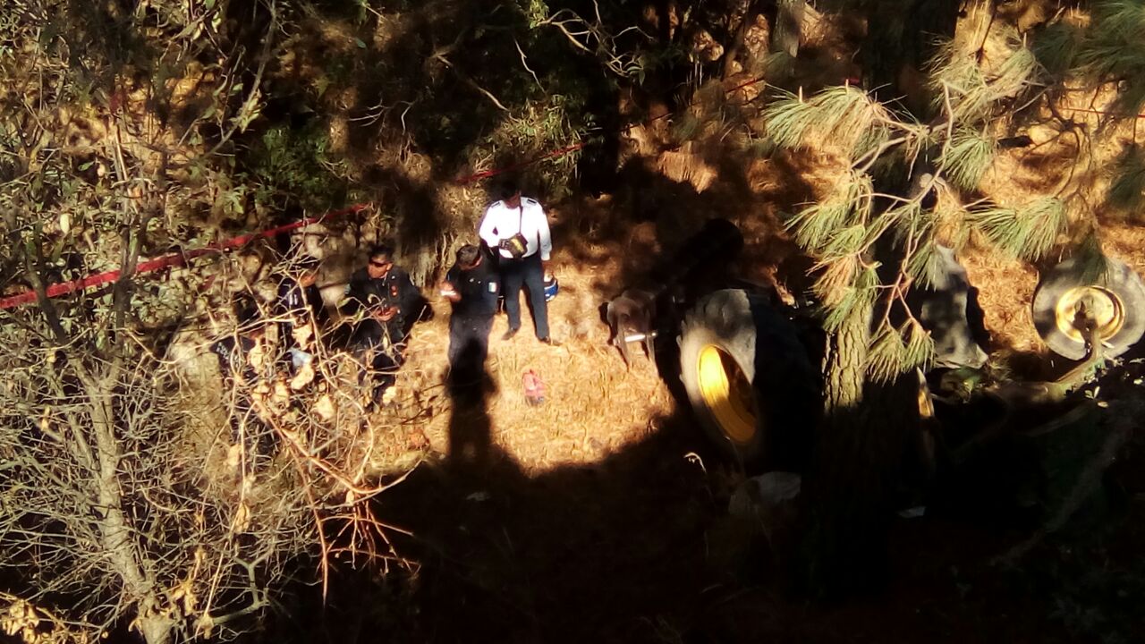 El reporte señala que en la comunidad de Santa María Aquiahuac, Braulio -N- de 40 años de edad realizaba labores del campo manejando un tractor, el que al ir en reversa cayó a una barranca y con la inercia su único tripulante murió; el que quedó en la base de un árbol y la pesada unidad encima.