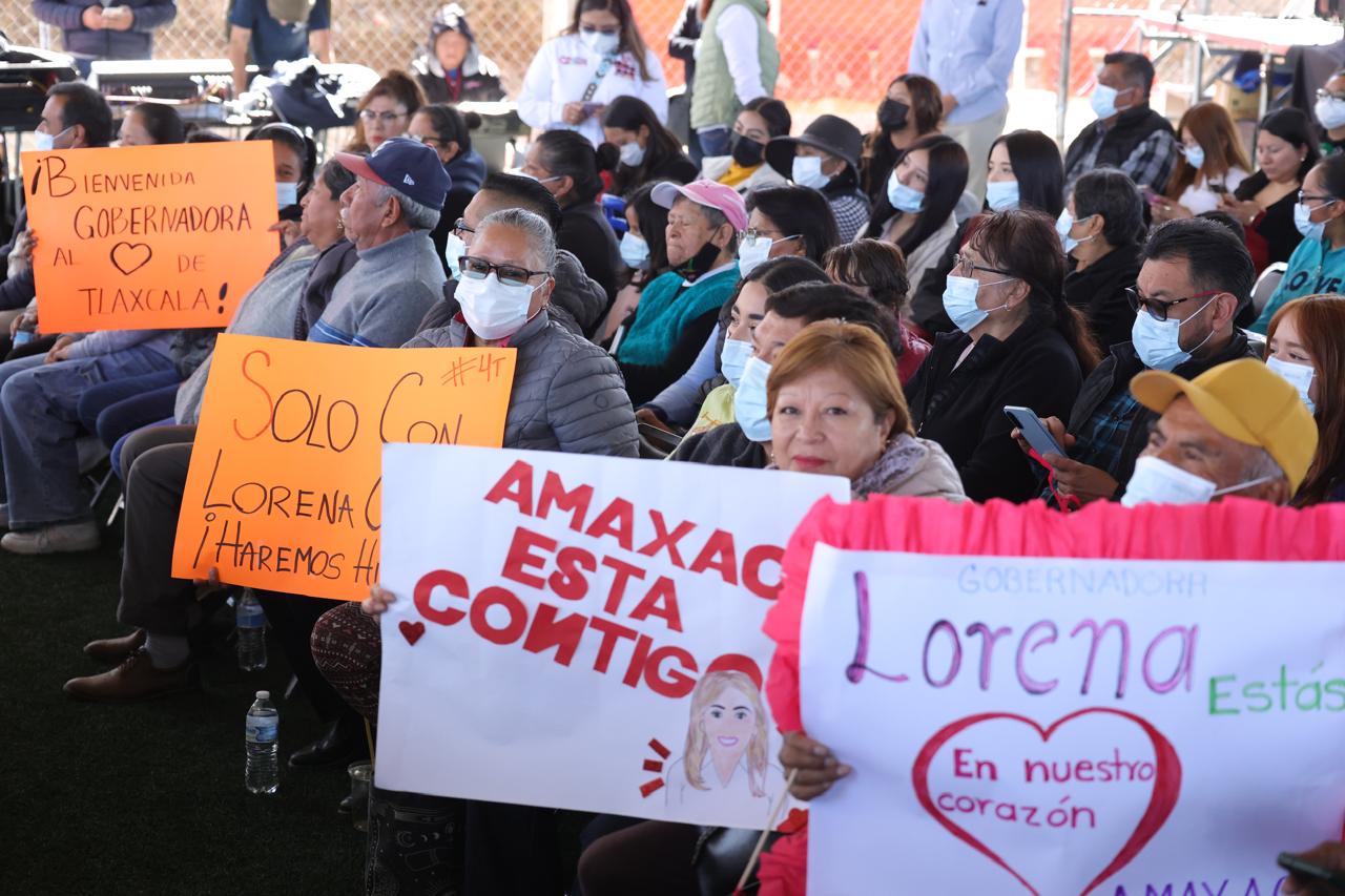La mandataria estatal agradeció el recibimiento de la ciudadanía, que reconoció con aplausos, porras y cartulinas de apoyo, los avances que registra Tlaxcala, como resultado de las acciones realizadas por la presente administración.