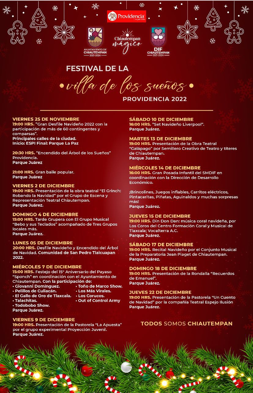 El Ayuntamiento de Chiautempan en coordinación con Grupo Textil Providencia, presentaron el programa general del Festival “Villa de los Sueños Providencia 2022”, con el propósito de que la sociedad disfrute de actividades propias de las fiestas decembrinas.