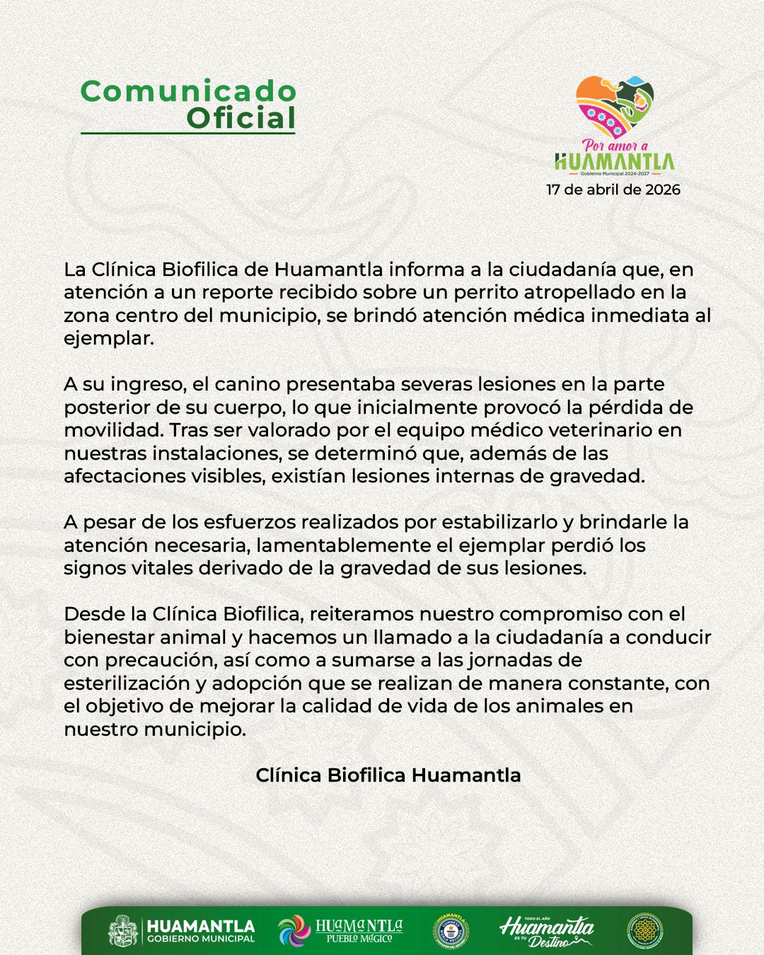 Desde la Clínica Biofilica, reiteramos nuestro compromiso con el bienestar animal y hacemos un llamado a la ciudadanía a conducir con precaución, así como a sumarse a las jornadas de esterilización y adopción que se realizan de manera constante, con el objetivo de mejorar la calidad de vida de los animales en nuestro municipio.