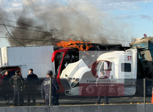 Vehículos arden en el Libramiento tras choque múltiple entre ADO, tráiler y camioneta en Huamantla