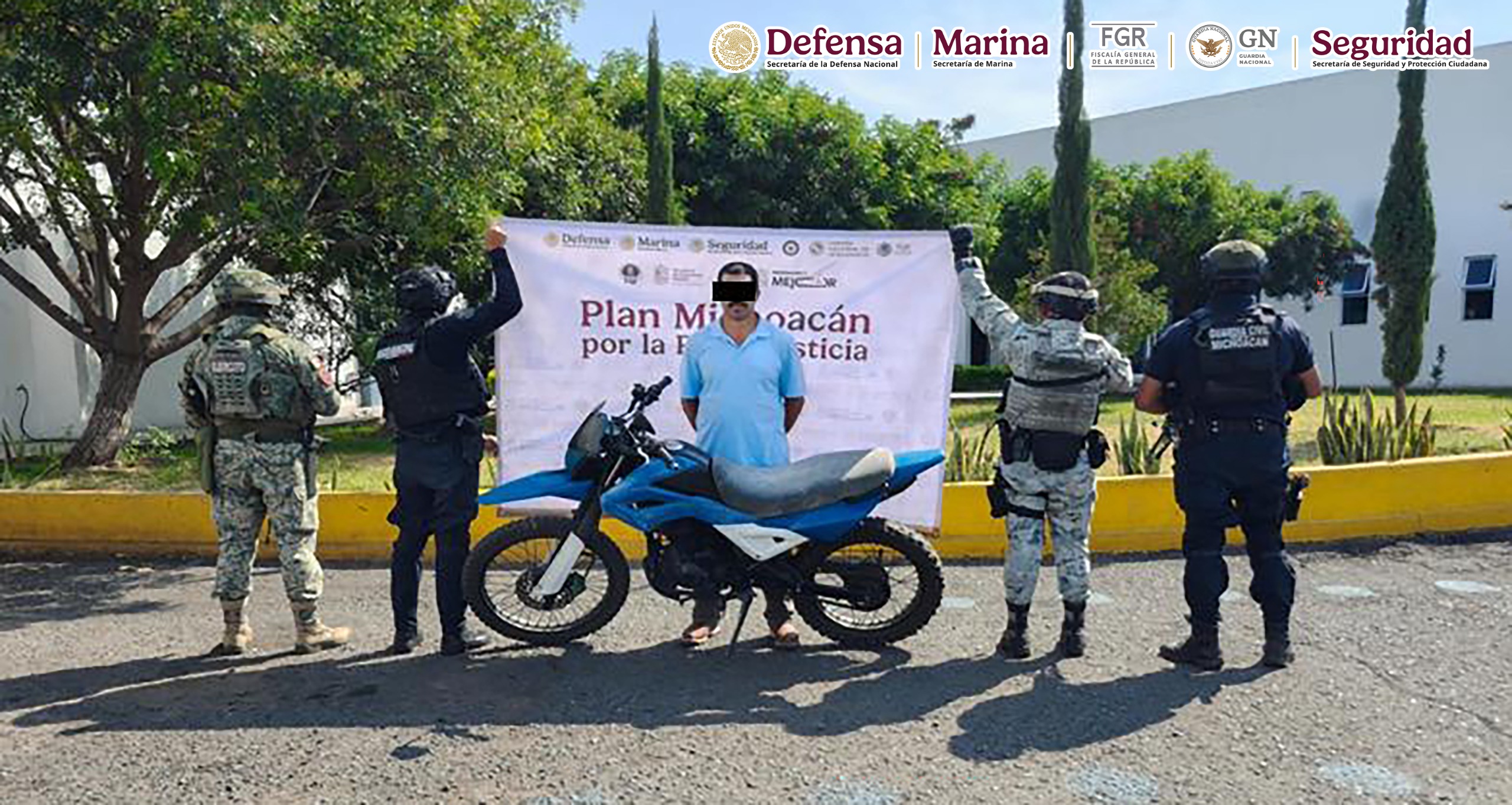 Resultado de las acciones operativas del “Plan Michoacán por la Paz y la Justicia”, elementos de la Secretaría de la Defensa Nacional (Defensa), Guardia Nacional (GN), en coordinación con la Secretaría de Marina (Semar), Fiscalía General de la República (FGR), Secretaría de Seguridad y Protección Ciudadana (SSPC), junto con la Secretaría de Seguridad Pública (SSP) y Fiscalía General del Estado (FGE) detuvieron a ocho personas y aseguraron dos armas de fuego, nueve vehículos e inhabilitaron dos campamentos clandestinos.