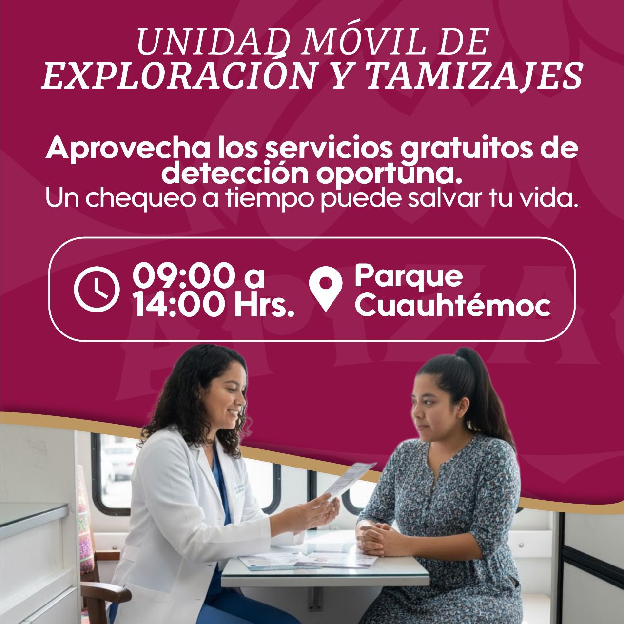 Además, durante toda la jornada, de 09:00 a 14:00 horas, estará disponible la Unidad Móvil de Exploración y Tamizajes, que ofrecerá servicios gratuitos de detección oportuna, recordando que un chequeo a tiempo puede salvar vidas.