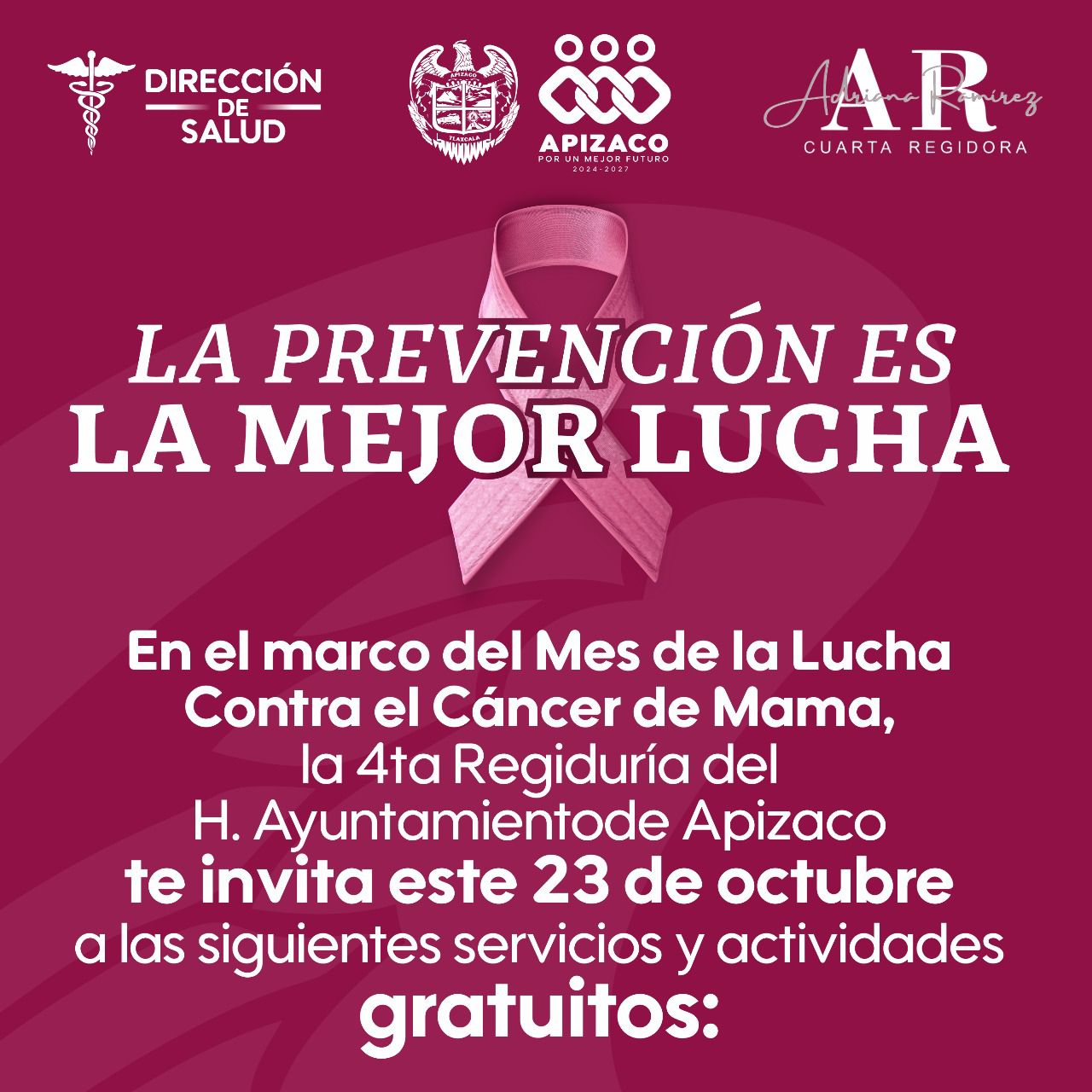 El Ayuntamiento de Apizaco, en coordinación con la Cuarta Regiduría, que encabeza Adriana Eugenia Ramírez Franco, invita a la población a participar en una serie de actividades gratuitas este 23 de octubre, en el marco del mes de la lucha contra el Cáncer de Mama.