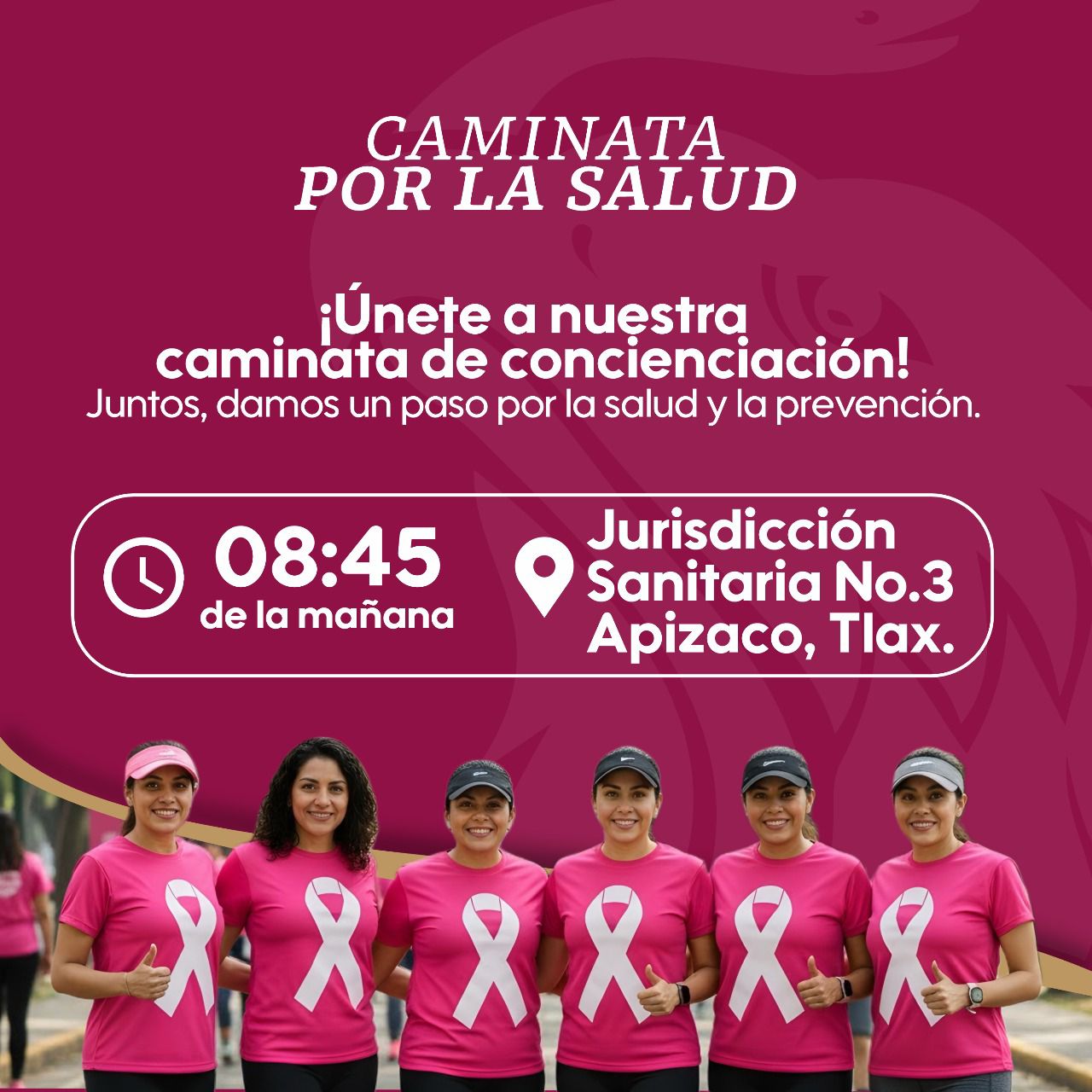 Las actividades iniciarán con una Caminata por la Salud, portando una prenda rosa, a las 08:45 horas, partiendo de la Jurisdicción Sanitaria No. 3, con el propósito de promover la importancia de la actividad física y la prevención.