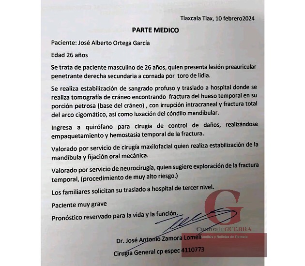 Fue el comentario en corta entrevista del médico tratante José Antonio Zamora Lomelí, jefe de los servicios médicos de la plaza en la que se desarrolló el festejo y reconocido especialista en trauma taurino, quien en el parte médico oficial resumió el manejo inicial de la lesión y estableció: