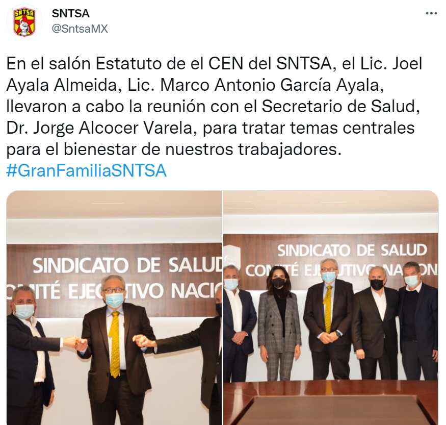 En redes sociales, el SNTSA informó que en el salón Estatuto del CEN, el senador y líder sindical Joel Ayala Almeida, junto con el presidente del sindicato García Ayala llevaron a cabo una reunión de trabajo con el titular de la Secretaría de Salud federal, Jorge Alcocer y Juan Antonio Ferrer titular del Insabi para tratar temas centrales para el bienestar de sus agremiados.