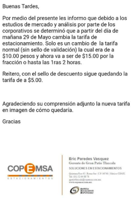 COPEMSA la empresa operadora del estacionamiento del Centro Comercial Gran Patio Tlaxcala, aumentó el costo de la tarifa de estacionamiento.