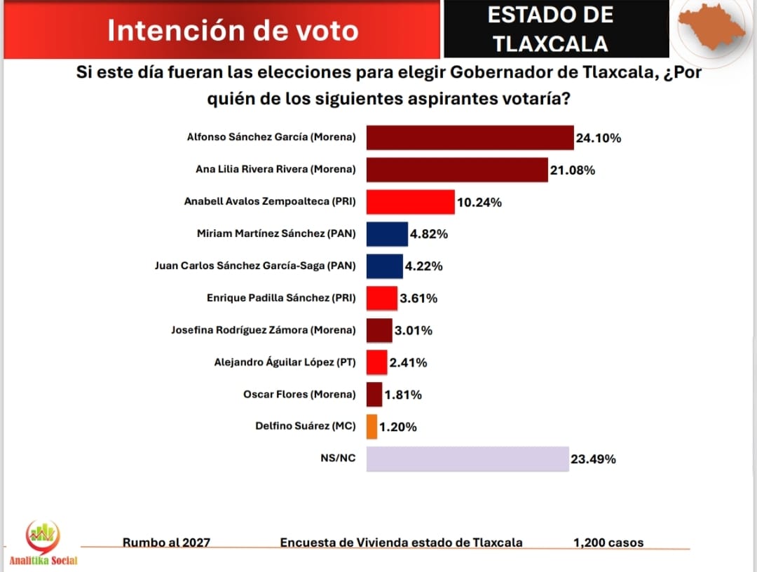 A poco más de un año y medio de la contienda por la gubernatura de Tlaxcala en 2027, el partido Morena se posiciona como la principal fuerza política en la entidad, y tras el respaldo mostrado en en diferentes plataformas digitales hacia Alfonso Sánchez, el estudio levantado por la empresa Analitika entre el 24 y 28 de noviembre de 2025 muestra una clara tendencia a favor de la izquierda, aunque la competencia interna se mantiene reñida.