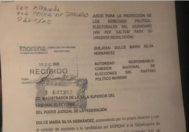 La precandidata de Morena a la gubernatura del estado, Dulce María Silva Hernández, presentó un recurso de impugnación ante el Tribunal Electoral de Poder Judicial de la Federación, en contra del proceso interno que realizó la Comisión Nacional de Elecciones en Tlaxcala.