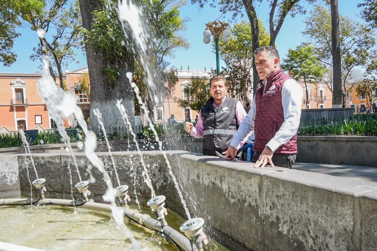 Acompañado del director de Servicios Públicos, Gabriel Lozano Montalvo, el alcalde constató el estado físico y operativo de las fuentes, que actualmente ya funcionan al 100 por ciento en la plaza principal, las cuales además cuentan con iluminación nocturna.