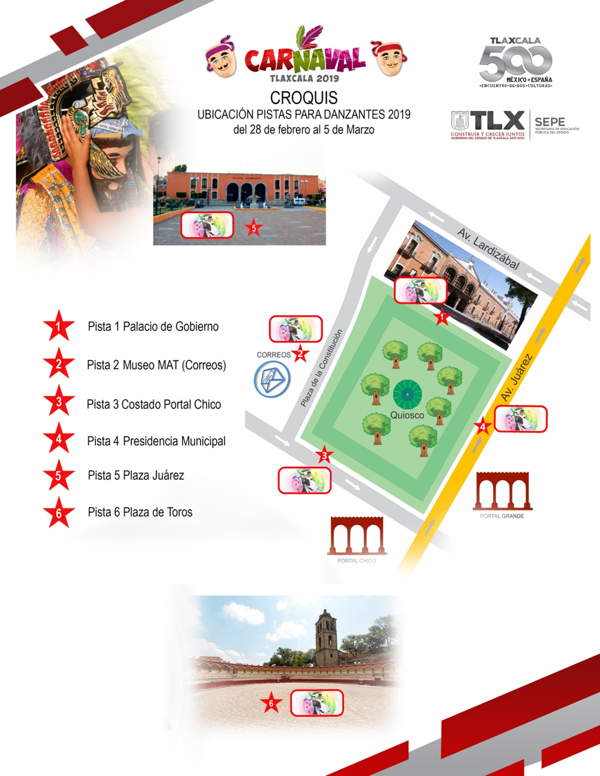 La Secretaría de Educación Pública del Estado (SEPE) habilitó seis pistas en el centro histórico de Tlaxcala, con el propósito de que visitantes locales, nacionales y extranjeros disfruten de las danzas tradicionales del “Carnaval Tlaxcala 500 años”.