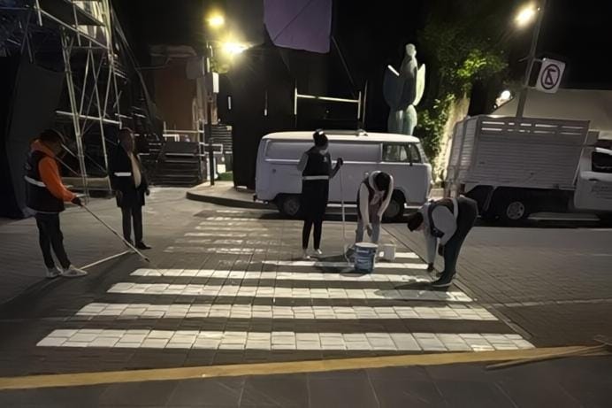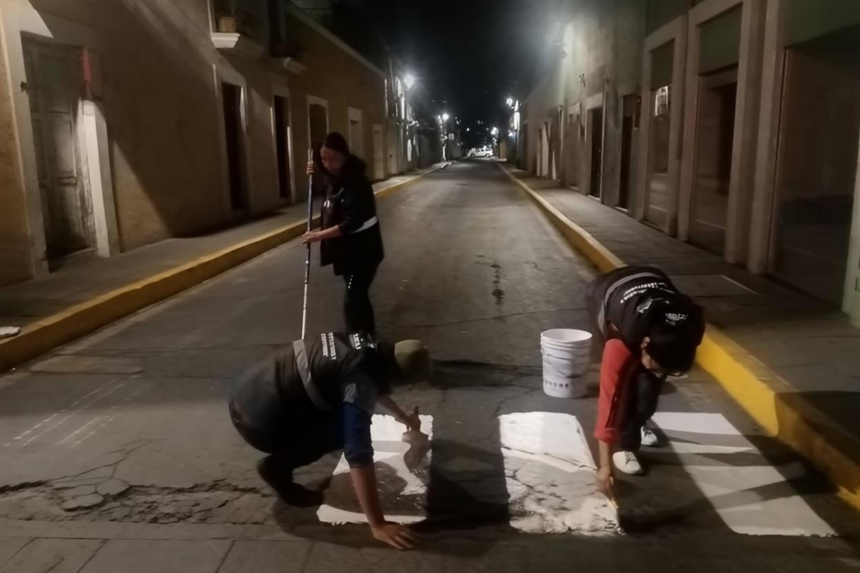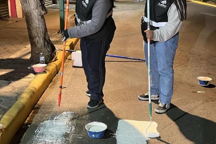 A partir de las 21:00 horas, personal de distintas áreas operativas llevó a cabo labores de pintado de guarniciones en diversas calles del Centro de la ciudad, con el propósito de mejorar la movilidad y reforzar la seguridad vial en las principales avenidas.